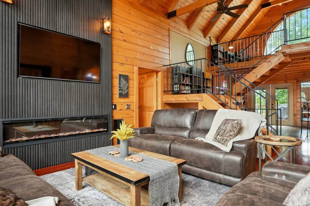 This spacious, modern-rustic cabin provides the comfort of luxury living in a tranquil setting that feels like a Smoky Mountains getaway—yet you're only 3 miles from local shops, restaurants, and groceries.